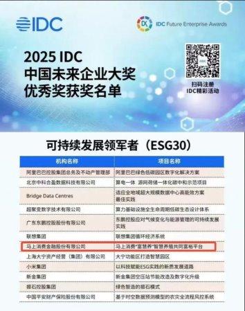 近日,国际权威研究机构IDC(国际数据公司)公布了本年度“未来企业大奖”获奖名单。马上消费凭借“富慧养智慧养殖共同富裕项目”荣获“可持续发展领军者(ESG30)”优秀奖。该奖项充分肯定了公司在科技赋能乡村振兴方面的探索和突破,也标志着马上消费在可持续发展领域的实践获得权威机构及社会各界的广泛认可。此次一同获奖的还有阿里巴巴、联想集团、小米集团、中国平安集团等企业。